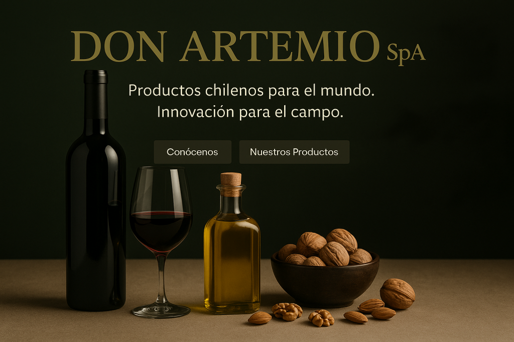Don Artemio SpA es una empresa chilena dedicada a conectar productos, soluciones y tecnologías de alta calidad con mercados nacionales e internacionales. Nuestro propósito es promover la excelencia de la producción chilena —vinos, aceite de oliva, frutos secos y alimentos— mientras impulsamos el desarrollo agrícola mediante la importación de arroz, maquinaria, fertilizantes y equipamiento tecnológico avanzado a través de nuestra marca propia AdaptaTech.